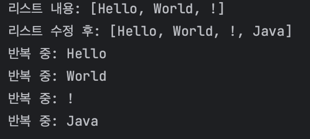 위 코드를 실행하면, add 메서드 호출 시마다 새로운 배열이 만들어지고, "Hello"와 "World"가 각각 리스트에 추가됩니다. 이렇게 쓰기 작업이 일어날 때마다 리스트 전체가 복사되므로 메모리 사용량이 늘어나지만, 읽기 작업은 기존 배열을 참조하기 때문에 안정적으로 수행됩니다.
