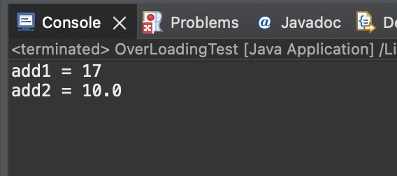 - 반환 유형은 오버로딩에 영향을 주지 않습니다. 메서드 이름과 매개변수만 고려됩니다.