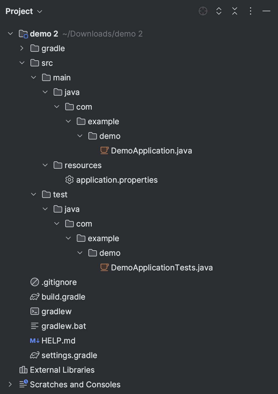 프로젝트를 다운로드 받고 압축을 해제하면, 기본적인 스프링부트 프로젝트 구조가 나타납니다. 주요 디렉토리 및 파일은 다음과 같습니다.